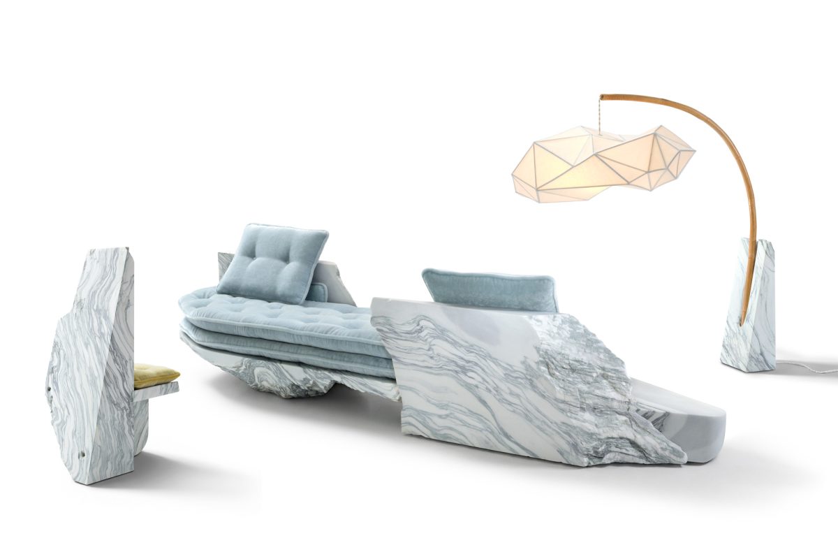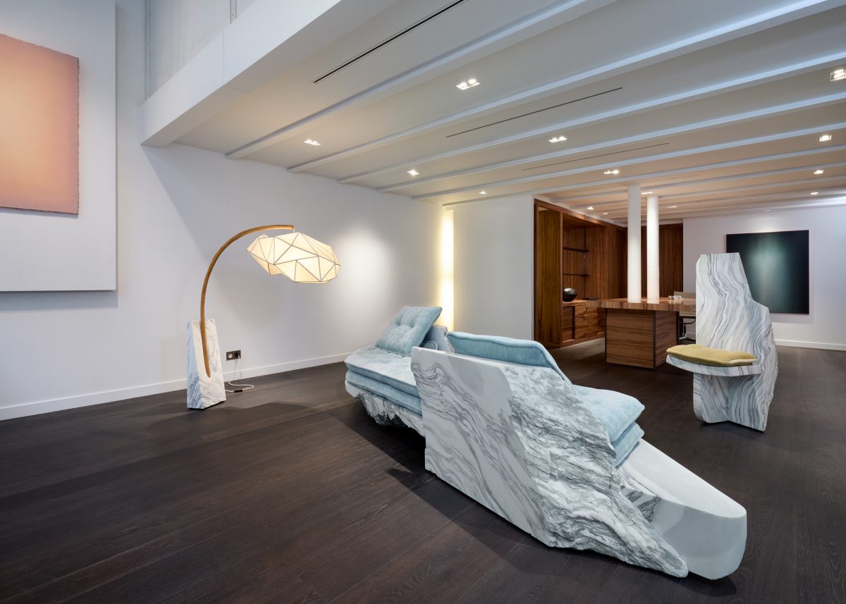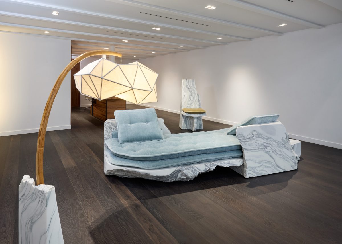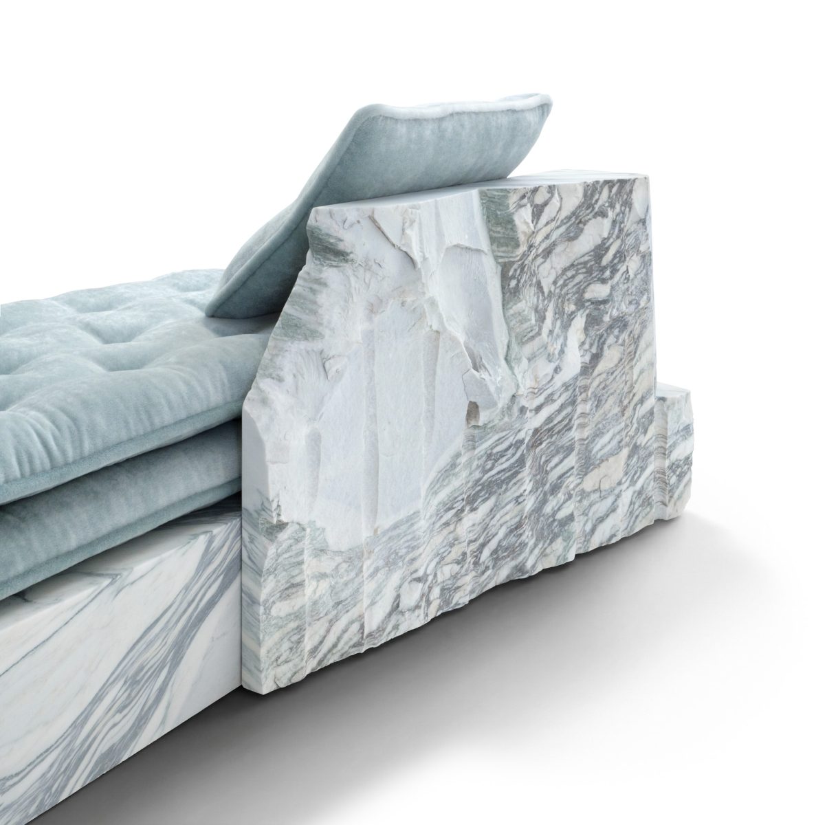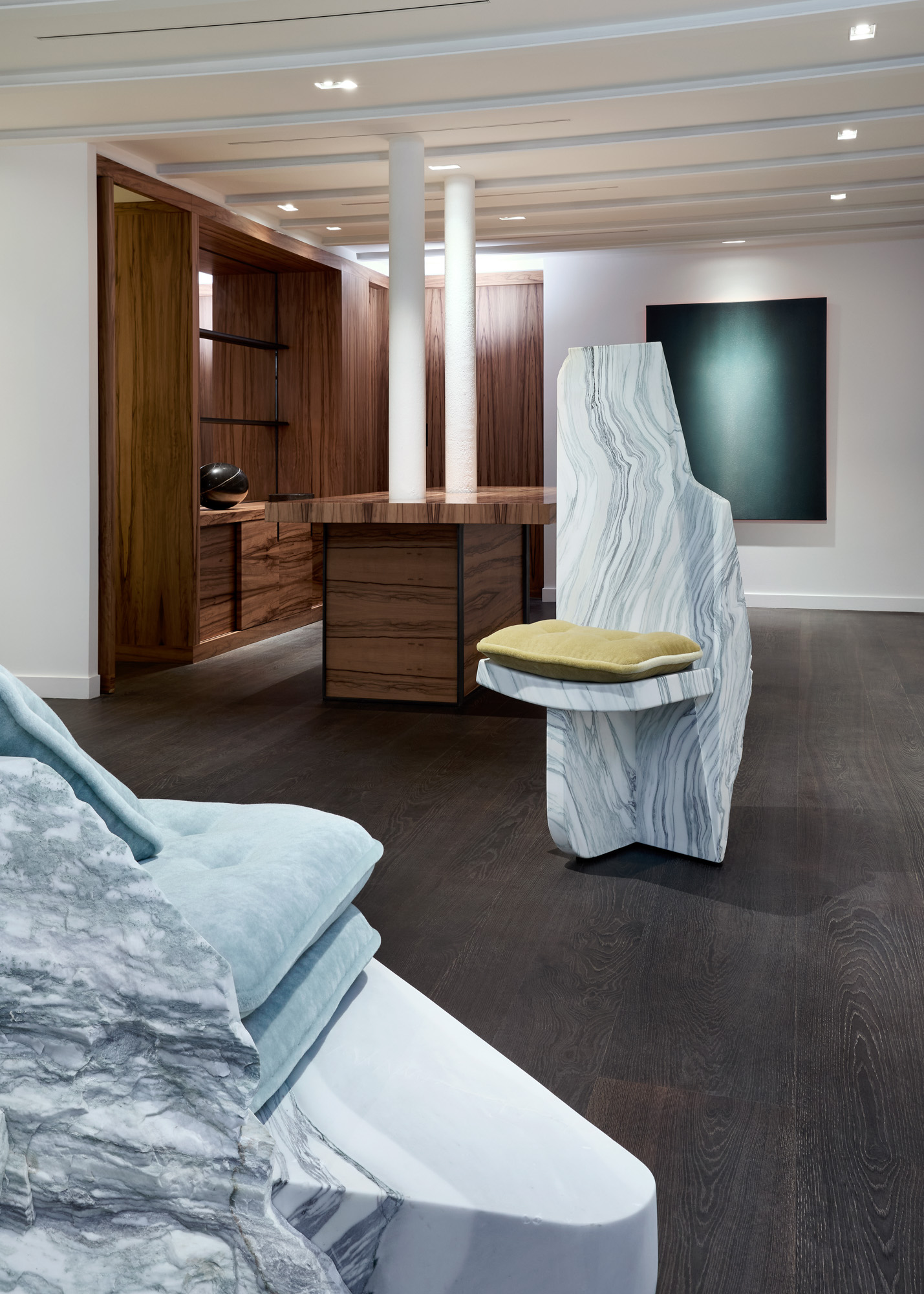 This project was developed without preliminary drawings, through a direct dialogue with stone and craftsmanship. The conversation daybed, sculptural chair and floor lamp were crafted by Les Marbreries de la Seine, and further shaped through the encounter of rarely associated savoir-faire: Le Lit National signs the upholstered comfort of the seating, while the floor lamp combines marble with rattan crafted by Michèle Thomé and washi paper by Fabien Ifirès.