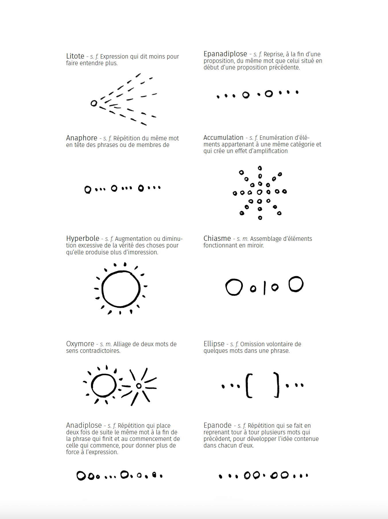 J’ai souhaité poursuivre mon exploration des liens entre design et littérature en m’intéressant à un procédé linguistique : les figures de style. La fonction première des figures de style est de donner plus d’expressivité et de vivacité au langage : Animer, substituer, opposer, insister, atténuer…