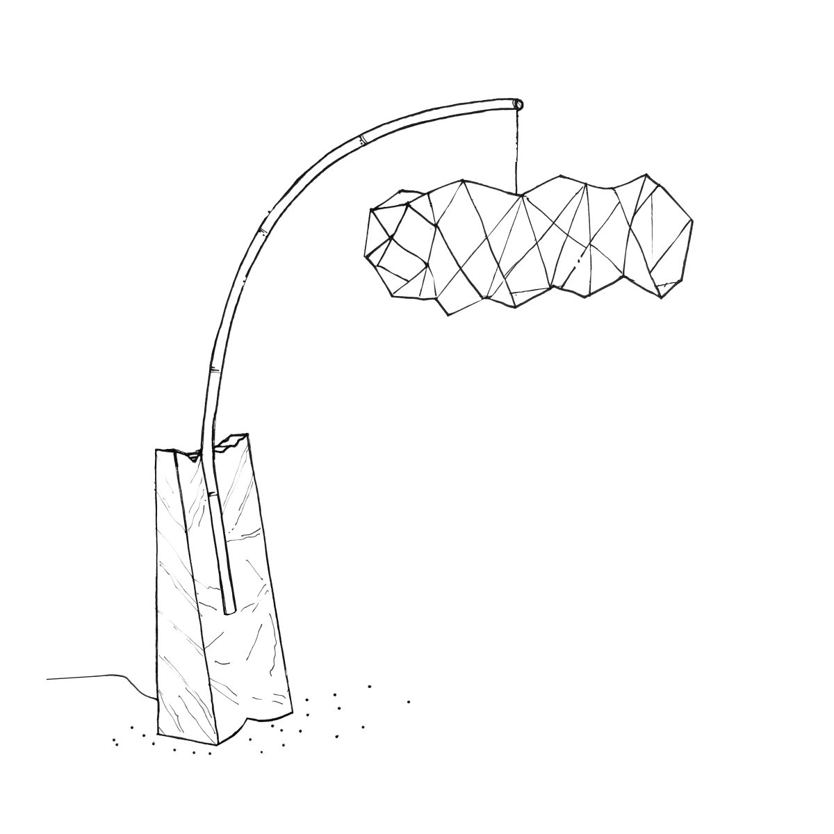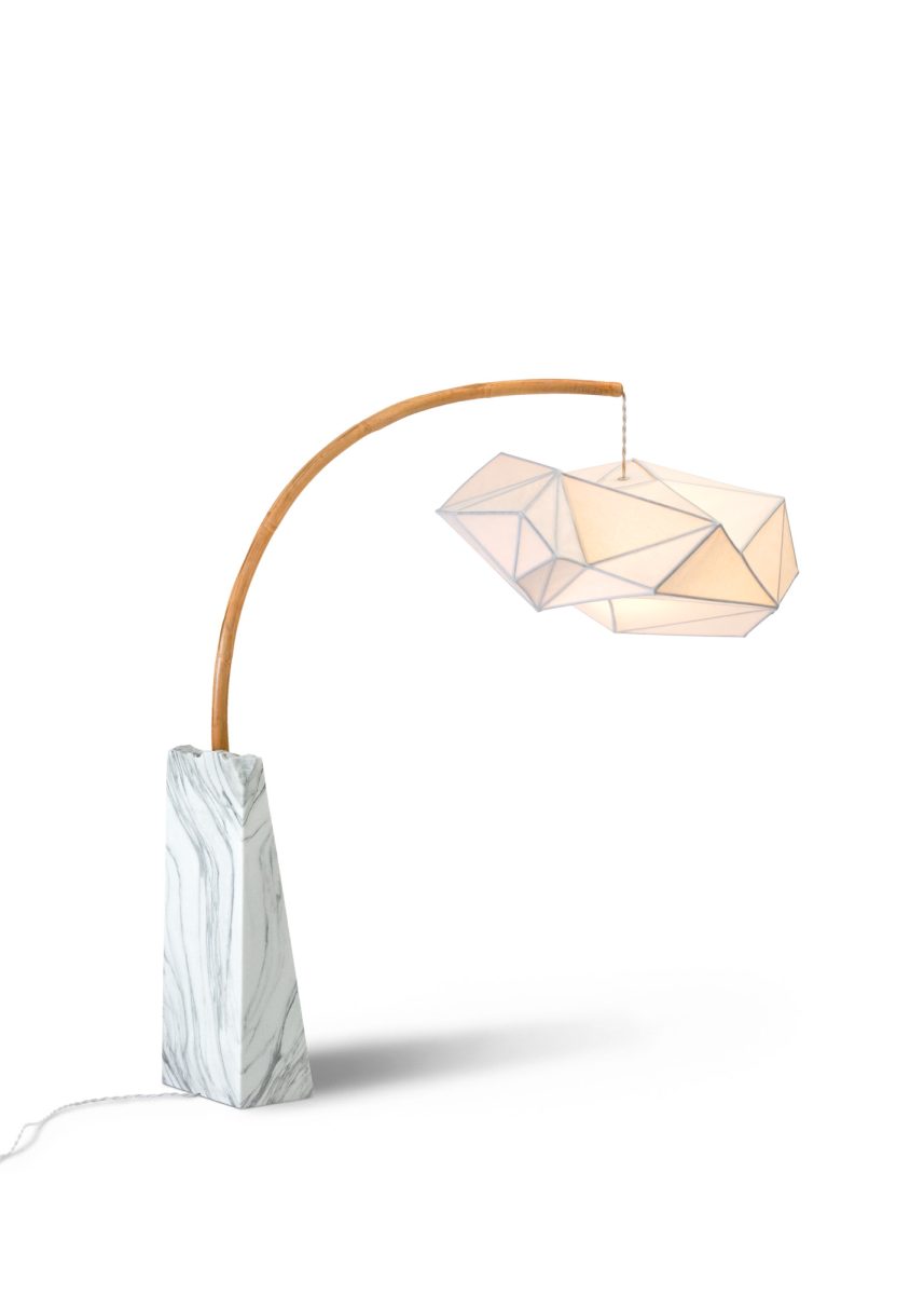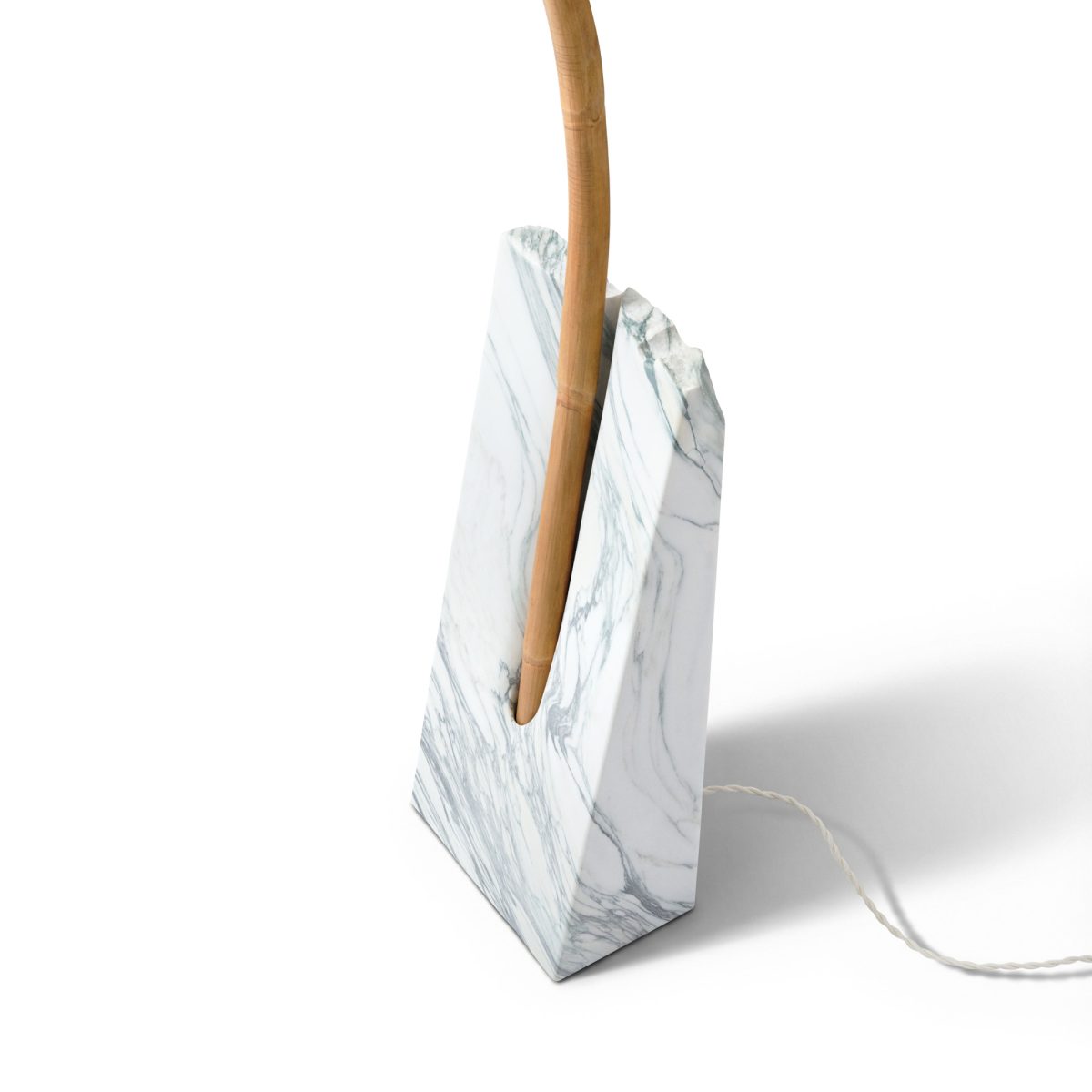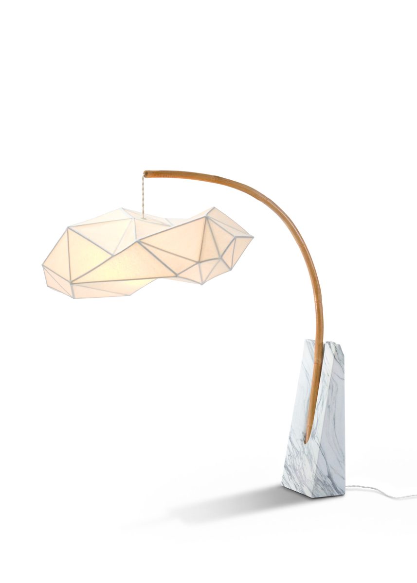 Pensée comme un objet vertical, presque totémique, la lampe associe la densité minérale du marbre à la légèreté du rotin et à la délicatesse du papier washi. Le socle sculpté agit comme un ancrage géologique, tandis que la structure s’élève avec retenue, laissant la lumière se diffuser de manière douce et enveloppante.